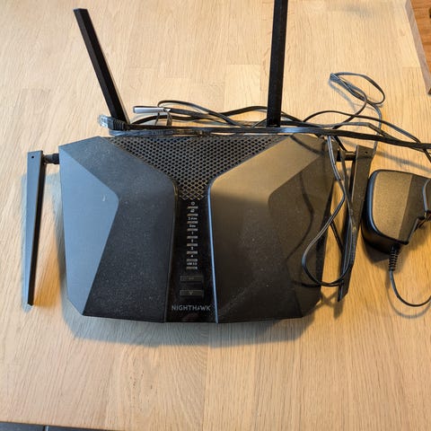 Linksys router med tre eksterne antenner.
