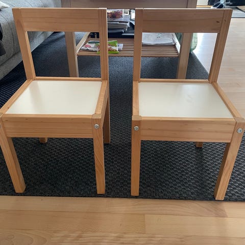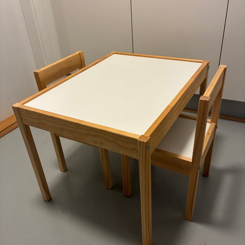 Sælger dette klassiske og praktiske LÄTT børnesæt fra IKEA bestående af et bord og to tilhørende stole. Sættet er lavet i lyst fyrretræ med hvide overflader, som er nemme at tørre af efter leg, tegning eller små måltider.