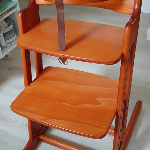 Træ højstol til baby med integreret bord og hjul. Stolen har rund siddeplads med ryglæn og sikkerhedsrem foran. Konstruktionen er i lyst træ med fodplade og tværstivere for stabilitet. Højstolen kan lægges ned, så den fungerer som lav stol med bord på hjul, hvilket giver mulighed for både spisning og leg for mindre børn. Velegnet til indendørs brug ved spisebord eller som selvstændigt møbel i køkken eller stue. Prisen er afhentningspris hos sælger