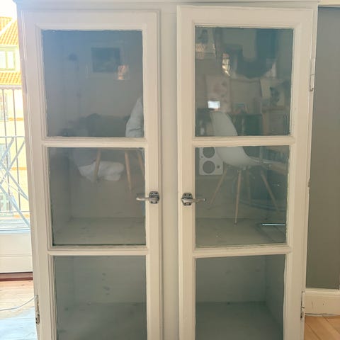 Gammelt vitrineskab i to dele, underskabet har skuffer og hylder. Skal afhentes. Skabet kan deles i to, og er dermed nemmere at transportere. Yderligere information kan søges på telefonummer: 21647098