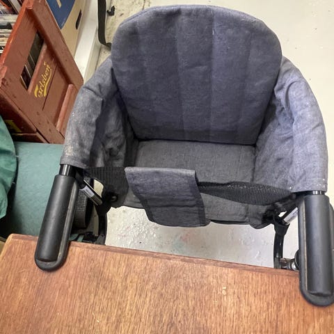 Basson Baby højstol i grå tekstil med sort stel. Højstolen har polstret sæde og ryg samt fastspændingsrem for barnet. Justerbare dele og remme gør det muligt at tilpasse stolen til barnet og til montering på en passende stol. Velegnet som spise- eller bordhøjstol til mindre børn.