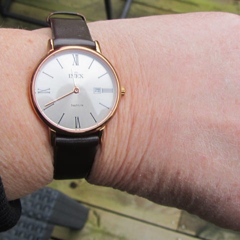 Inex dameur med rund hvid urskive og gylden urkasse. Uret har en brun rem i læderlook med struktur og klassisk spænde. Time- og minutmarkeringer er i gylden farve, og der er lille datovisning på urskiven. Bagsiden af uret er markeret med Ibex-logo og modeloplysninger. Velegnet som hverdags- og konturur til kvinder, der ønsker et enkelt og klassisk analogt armbåndsur.