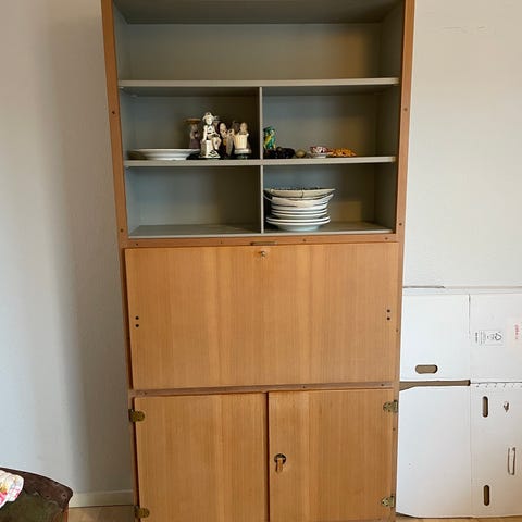 Det fineste gamle Københavner køkkenskab med skydelåger i matteret glas. Med både hylder og skuffer. Det er lige til at hænge op, men man kan også give den en lille klat maling inden hvis man lyster.