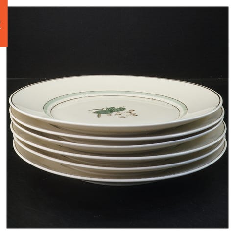 Dette er et sæt bestående af 6 dybe middagstallerkener med en diameter på 25 cm. Tallerkenerne har en lys farve med en dekoration i midten, der inkluderer et bladmønster. De har en bred kant og en let buet form, hvilket gør dem ideale til servering af måltider.