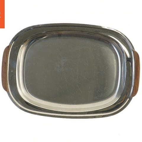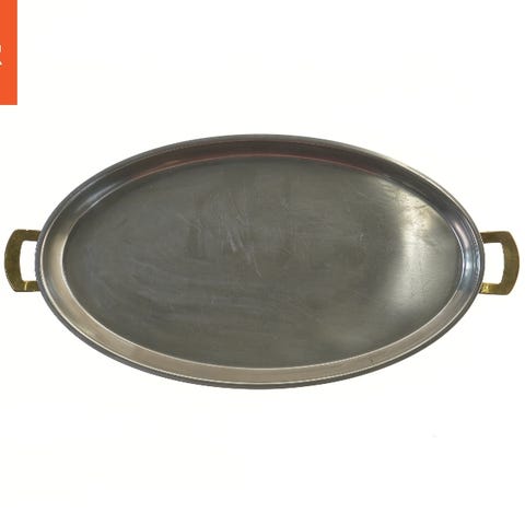 Denne bakke er lavet af metal og har en rektangulær form med dimensionerne 37x26 cm. Den har træhåndtag på begge sider, hvilket gør den let at bære. Bakken har lette brugsspor, men er stadig funktionel som en serveringsbakke til hjemmet.