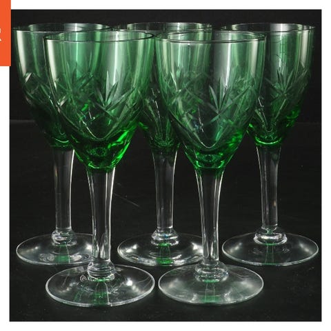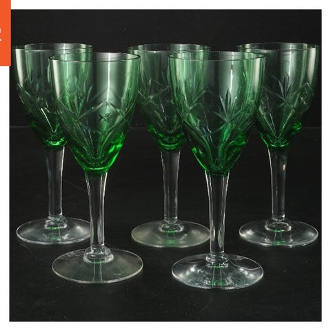 Et sæt med 5 krystal vinglas med indgraveret mønster. Glasene har en rund fod og elegant stilk. Hver glas har en diameter på 7,5 cm og en længde på 17 cm. Velegnet til middagsselskaber og formelle anledninger.