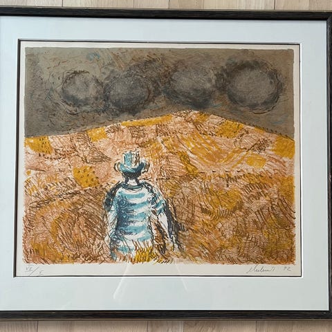 Litografi med motiv af et landskab med træer og køer i forgrunden. Billedet er udført i flere farver, primært grønne, beige og grå nuancer.