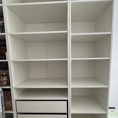 Med Ikeas kompliment skuffer i både venstre og højre side af skabet. 4 små i højre side og 4 store i venstre side. 1 trådkurv i hver side.