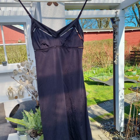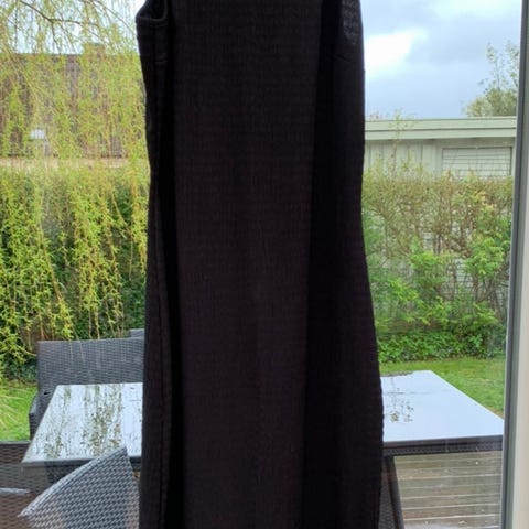 H&M sommerkjole til dame i str. 36. Kjolen er sort og lavet i bomuld. Den har dyb V-udskæring foran og smalle stropper med snøre-detalje på ryggen. Modellen er taljeret med elastik i taljen og har et langt, let faldende skørt, egnet som sommerkjole til hverdagsbrug eller ferie.