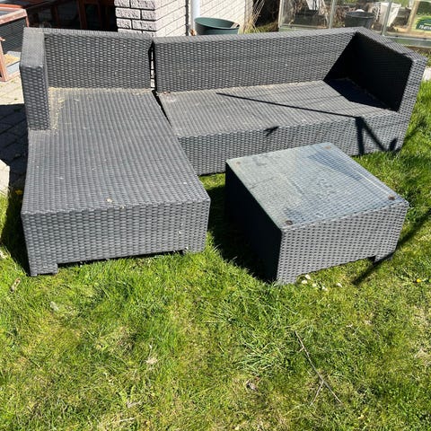 Sofa lounge bord i sort polyrattan med glasplade. God stand, trænger til glasrens og måske nye sugekopper.