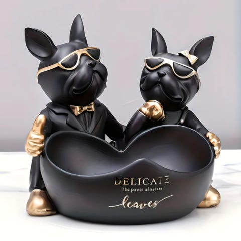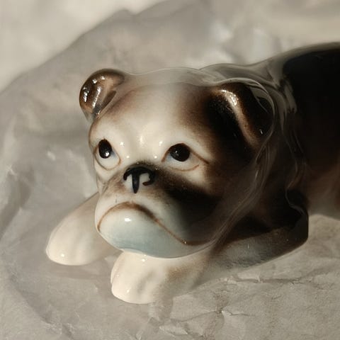 Bulldog, porcelæns hund med halskæde med ben vedhæng.