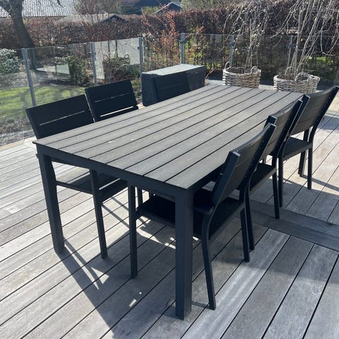 Havebord med 8 matchende stole i sort. Kvadratisk bord med lamelbordplade (nonwood) og ben i metal. 150x150 cm