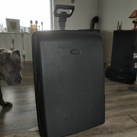 Fin løbehjuls kuffert. Kan tages med som håndbagage på flyveren. Kan bruges som løbehjul i lufthavnen eller på ferien, når barnet ikke gider og gå mere. Løbehjulet slås sammen og sættes i hak, så det ikke falder ned. OBS! malingen skaller af nogle steder, da jeg selv har malet den lyserød, de steder den var blå.