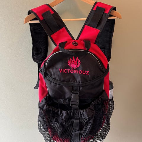 Sports bag with hand straps and adjustable shoulder strap, with a side pocket that has space for sneakers.