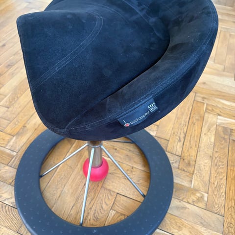 BackApp stol i sort Alcantara, kompositstof, med sølvgrå stel og med en rød kugle. Når du sidder på BackApp stolen, træner du de muskler der støtter rygsøjlen.
