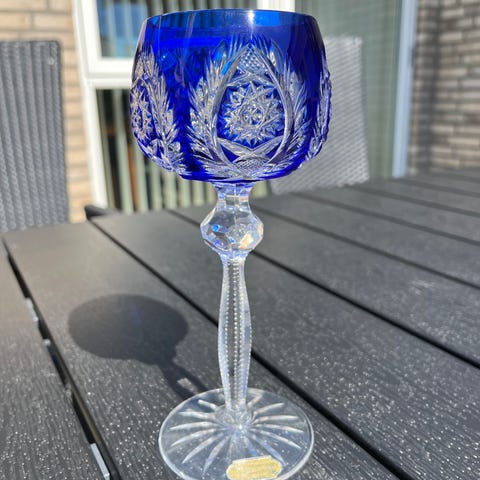 super fint Rømer krystal vinglas i henholdsvis blå og rød.