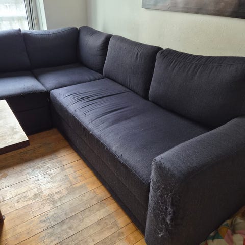 Sofaen er godt brukt, og kunne hatt godt av å trekkes om. liten feil i puten under sofa, da den fort kan dette ned.