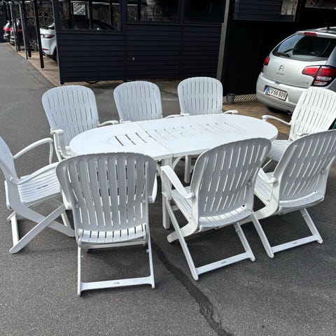 Super flotte udendørs stole i hvid plast fra Victoria & Albert. Mål 74 x 62 x 70 cm. Pris pr stk. 3000 kr.