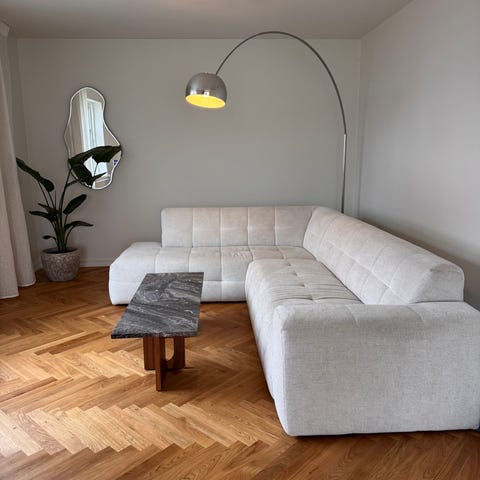 Jysk hjørnesofa i lys beige stof. Sofaen har chaiselong i venstre side (set forfra) og er polstret med brede, kvadratiske sæde- og rygsektioner. Stoffet fremstår som vævet tekstil i en neutral, lys beige farve, der passer ind i mange typer indretning. Velegnet som rummelig sofa til stue eller opholdsrum med plads til flere personer at sidde eller ligge afslappet. Er åben for bud.