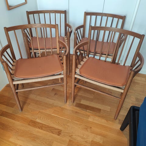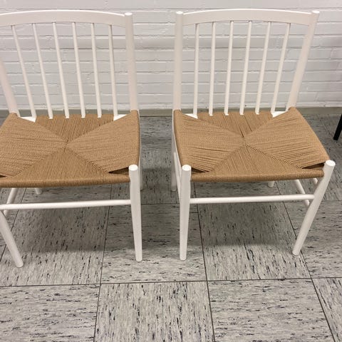 Jeg har lagt et nærbillede af flet fra en fabriksny stol vs de originale jeg sælger, der er ret stor forskel, både snorens overflade og 3D og hvor tæt de sidder. Jeg er tænker at der er flere år tilbage i flettet på vintagestolene end på en fabriksny.