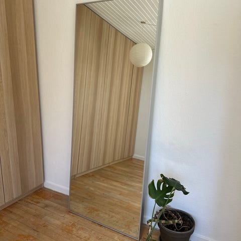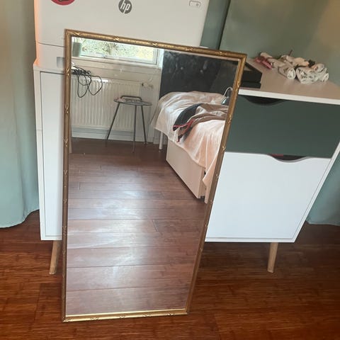Fritstående stort spejl med guldramme. Måler 238 x 118 cm.