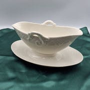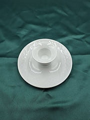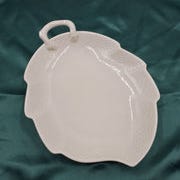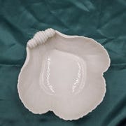 Dekoreret porcelænsskål med bølget kant og glat overflade, ideel til servering af snacks eller som dekorativt element på bordet.