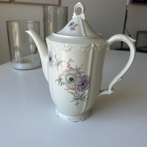 Porcelæn kaffekander med låg blomsterdekoration hvid
