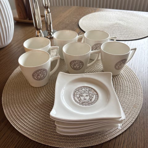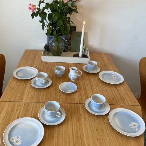 Kopperne måler 6 cm i højden, underkopperne har en diameter på 14 cm, og kagetallerkenerne måler 17 cm i diameter.