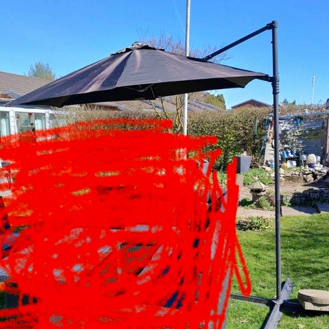 Havesæt bestående af to solsenge og en hængeparasol. Solsengene er udført i rattan-look med justerbart ryglæn og medfølgende hynder i grå tekstil. Stellet på solsengene fremstår i lyst metal. Hængeparasollen har mørk skærm og fritstående stel, der kan placeres ved siden af solsengene for skygge. Velegnet til terrasse eller have som ligge- og afslapningsplads.
