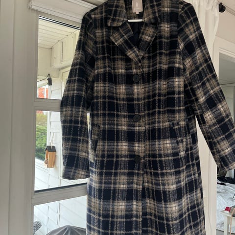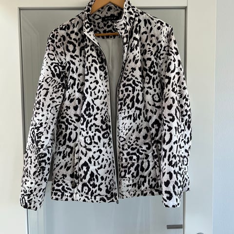 Flot kort jakke til kvinder i str. 40. Jakken er i gråmeleret polyester og uld med struktureret vævning og har et kort, figursyet snit. Den har lange ærmer, krave og forlommer. Indvendigt er der glat foer med mønster. Velegnet som let jakke til hverdag eller pænt brug.