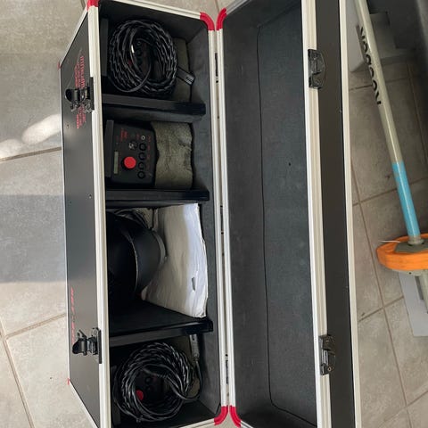 Der medfølger stativ, ny paraply, strømforsyning til alle 3 og en trådløs enhed til kamera og Blitz, der får dem til at blitze billedet i rette øjeblik.