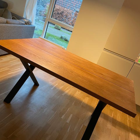 Spisebord i massiv træ med rektangulær bordplade i brun træfarve. Bordet har tydelig træstruktur og naturprægede kanter. Understellet består af sorte metalben i krydsform. Velegnet som spisebord i køkken eller stue med plads til flere stole langs siderne.