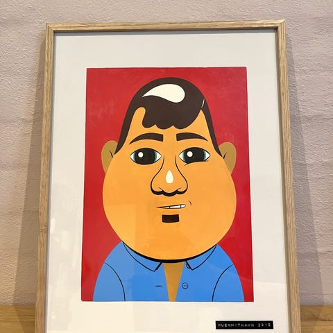 Sælger dette karakteristiske og signeret værk af den anonyme, københavnske kunstner HuskMitNavn. Billedet bærer titlen "Please Come Back" og viser en af kunstnerens ikoniske, duknakkede figurer i en humoristisk og hverdagsagtig situation, som han er så kendt for.