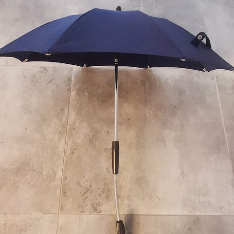 Paraplyen er næsten som ny og kun brugt meget lidt. Den monteres nemt med justerbart beslag og kan vinkles efter behov, så barnet får god skygge på solrige dage.