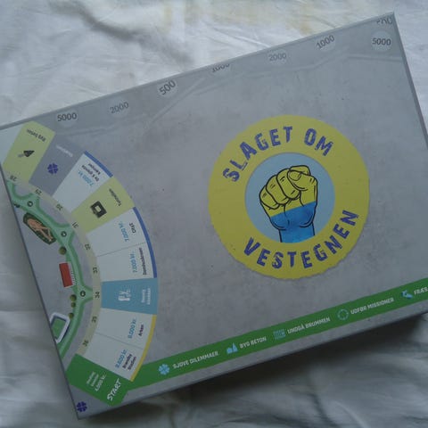 Slaget om Vestegnen brætspil. Spillet består af spilleplade, kort, terninger, spillebrikker og papmarkører. Temaet er områder og steder på Vestegnen, hvor spillerne bevæger sig rundt på banen og løser forskellige missioner. Egnet som selskabsspil for flere deltagere. Spillet leveres i æske med indsatser til organisering af indholdet.
