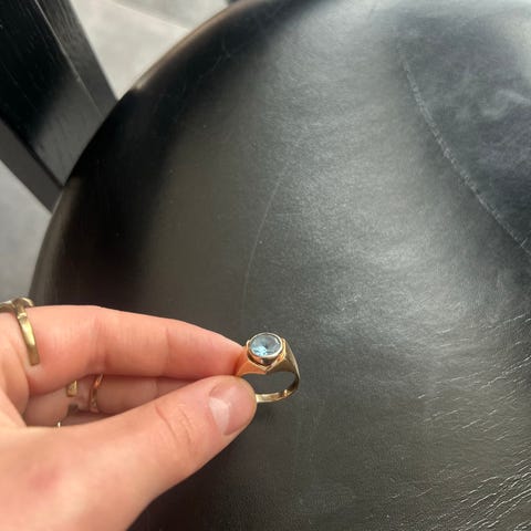 Ringen har været højt elsket og godt brugt, men desværre kan jeg ikke passe den mere. Den har været fuldt belagt med guld, men dette er delvist slidt af nu (se fotos). Jeg synes, det kun bidrager til vintagelooket, og man kan altid få den belagt med guld igen, hvis dette ønskes.