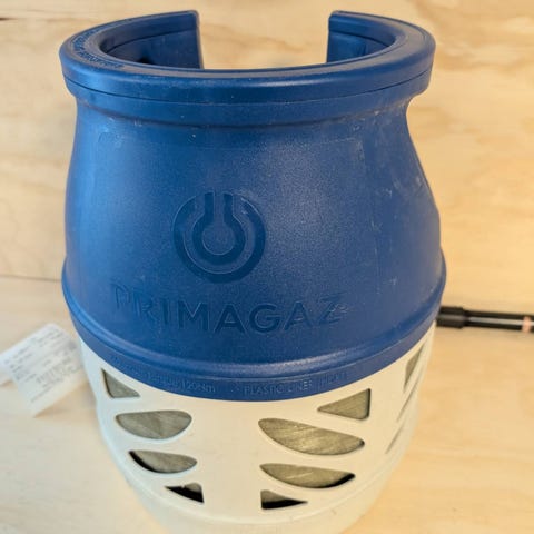 Primagaz gasflaske i kompositmateriale i blå og hvid. Flasken er egnet til brug med gasgrill, terrassevarmer, campingudstyr eller andre gasapparater, der passer til denne type flaske. Kompositkonstruktionen gør flasken lettere end traditionelle stålflasker og med greb i toppen for nem håndtering.