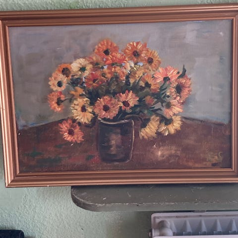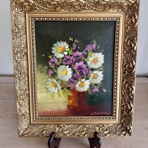 Motivet er klassisk og romantisk – valmuer, margueritter og vilde blomster samlet i en enkel glasvase. Men det, der virkelig gør det her billede særligt, er maleteknikken: det er malet i olie med tydelige lag og struktur, hvor nogle af blomsterne næsten får et let “opbygget” eller næsten træagtigt udtryk i overfladen. Det giver en dybde og et spil i lyset, som man ikke fanger på billeder – det skal ses i virkeligheden.