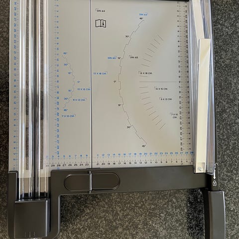 Ideal 1038 papirguilotine i grå med røde betjeningsgreb. Skærebordet har påtrykte formatmarkeringer til forskellige papirstørrelser samt indbygget lineal langs kanten for præcis opmåling. Udstyret med lang skærehåndtag, gennemsigtig sikkerhedsskærm og justerbart anslag til papiret. Velegnet til skæring af forskellige elementer. Har været brugt til bogbinding.