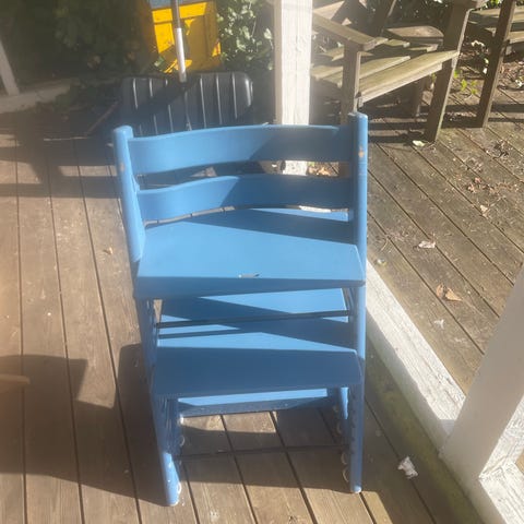 Stokke højstol i træ i turkis farve. Klassisk justerbar højstol med fodplade og siddeplade, der kan indstilles i højden efter barnets størrelse. Egnet som spise- og siddeplads ved bord for børn. Velegnet til brug i køkken eller spisestue, hvor barnet kan sidde ved bordhøjde sammen med resten af familien.