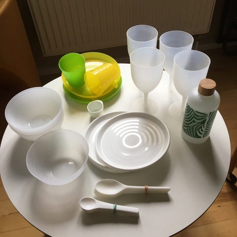 Den kan trækkes i, så den kan blive stor og lille. Der er flere forskellige låg med til den. Fra Sueasy. Drikkedunk. Har glas og gaffelsymbolet.