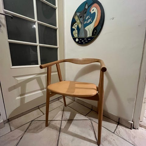 Hans J Wegner stol i eg med polstret sæde i lyst og den dyre naturlæder læder. Stolen har buet ryg- og armlæn i ét stykke og runde ben. Undersiden er mærket med Getama og angiver design af Hans J Wegner. Velegnet som spisebordsstol eller enkeltstående stol i stue, kontor eller entre.
