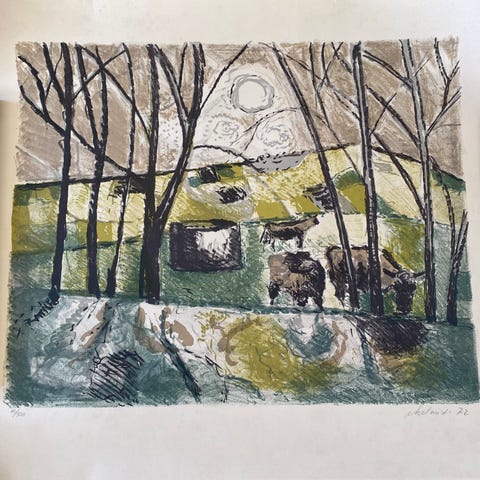 Maleri med motiv af får på en grøn bakke under en dramatisk, farverig himmel med sol. Billedet er malet i kraftige, strukturerede penselstrøg og fremstår i stærke blå, grønne, orange og rosa nuancer. Nederst i venstre hjørne ses signaturen “KL 78”. Maleriet er indrammet i en lys ramme. Velegnet som vægdekoration i stue, gang eller kontor. Kunstner KL 78