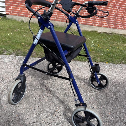 Rollator med sæde og kurv i blå metalramme. Udstyret med fire hjul, håndbremser på skubbehåndtag samt kurv under sædet til opbevaring. Egnet som ganghjælpemiddel til voksne, både indendørs og udendørs, afhængigt af underlag.
