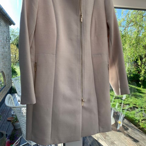 65%polyester/30%viskose/5%elastan, Næsten som ny.Flot damefrakke m. flere detaljer. Den har skjult knaplukning og elastikbælte. Et let pufærme, manchetter m. knap og 2 stiklommer.