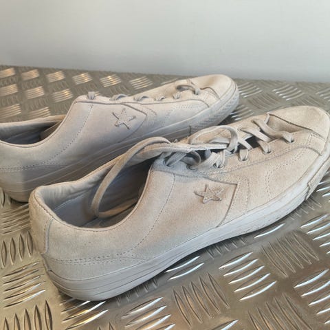 Converse sneakers i str. 48 i en ensfarvet grå tone. Lav model med snørelukning og gummisål. Overdel og sål er i matchende lys grå farve med mørkere ydersål. Velegnet som hverdagssko til fritidsbrug. Unisex-model der kan bruges af både mænd og kvinder. Jeg sælger ud af min samling. Unikke Converse sko i størrelse 48. Læder og andet specielt materiale. Enten ubrugte eller i god stand. Nypris: 600