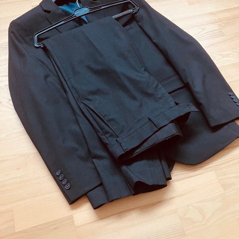 Jakken er str 52 og bukserne str 50.