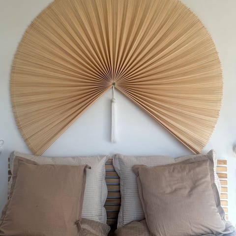 Paralume/ramme i et vandret gitter, med regelmæssige horisontale bindinger, fremhæver lysvirkningen: når lampen tændes, spreder den et omsluttende og dekorativt lys, der projicerer på gulv og vægge en rytmisk skygge-trame, særligt eftertragtet i boho-, coastal- og modernariat-indretninger.