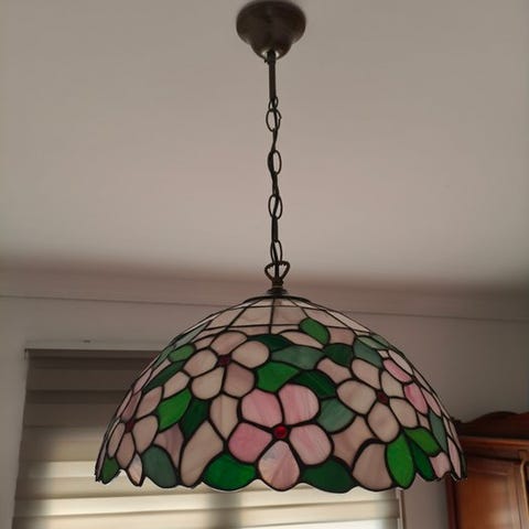Denne pragtfulde hængelampe i den tidsløse Tiffany-stil er et ægte kunstværk inden for glaskunst. Det håndlavede skærmdesign prægertil et detaljeret tulipanemønster i varme gule, røde og grønne nuancer, som skaber en hyggelig og indbydende atmosfære i hvert rum. Med en imponerende diameter på ca. 53 cm og den klassiske 3-flammede fatning er denne lampe ikke kun et lys, men et markant designelement i dit hjem.