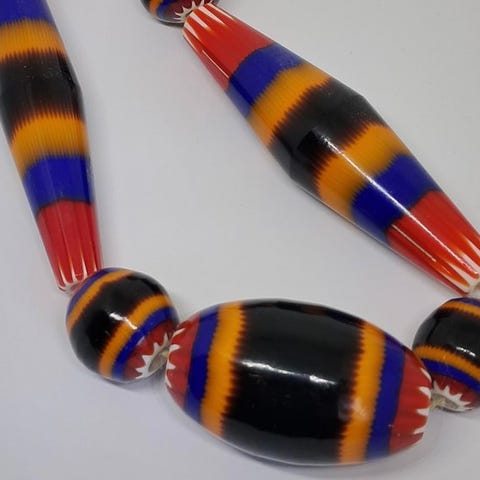 De mest iøjnefaldende perler tilhører 'vielsesperler', som især endte deres vej til Mali. Inden for typen af vielsesperler forekommer dråbeformede mange, men i dette halskæde er der tale om 'haajtænder' (på fransk også kaldet 'croissants' eller 'halve måner').